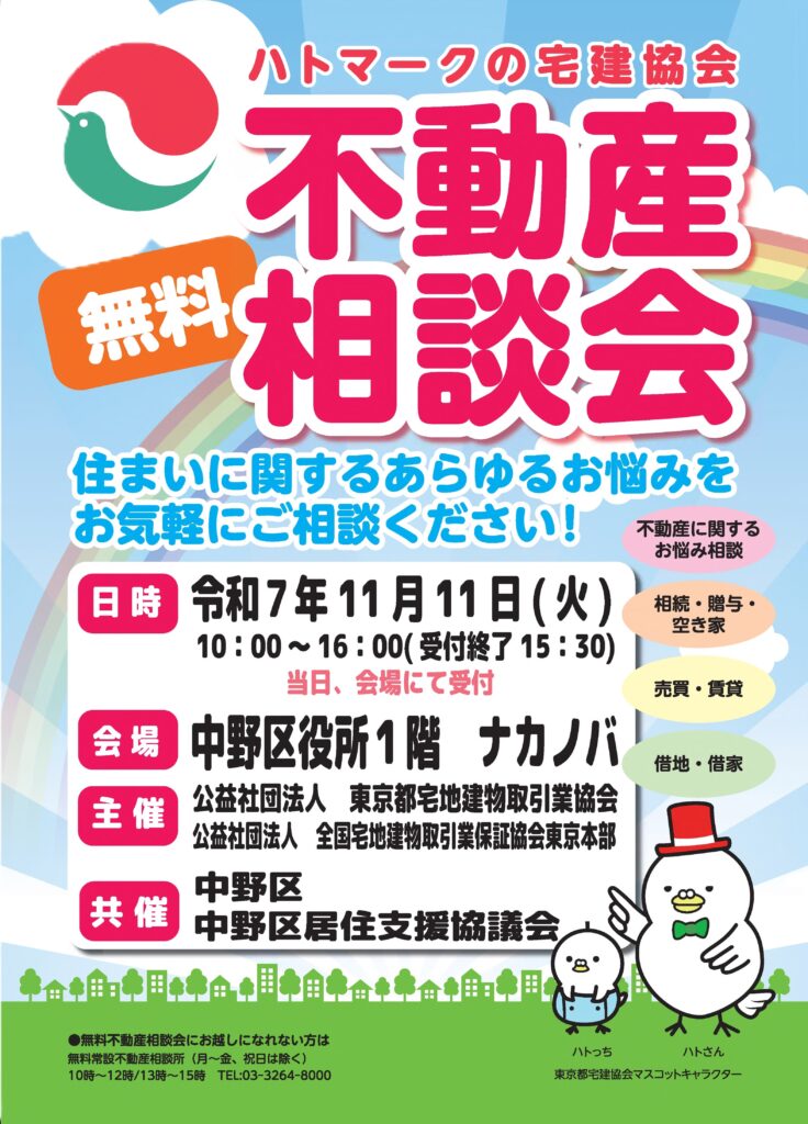 (公社)東京都宅地建物取引業協会第十ブロック中野支部・中野区・中野区居住支援協議会の共催で、相談会を実施します。